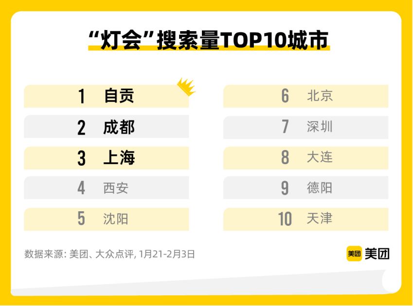 据美团数据,自贡、成都、上海是“灯会”搜索量排名前三的城市。搜索热度最高的五大灯会包括自贡灯会、上海豫园灯会、西安城墙灯会、深圳湾区超级灯会、成都青白江凤凰国际灯