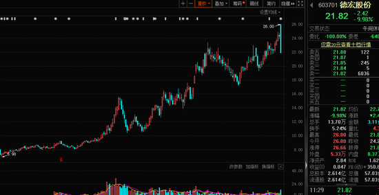 今日早盘,德宏股份(603701)高开后迅速跳水,一分钟内由开盘的涨7.26%变为跌9.11%,瞬间跌幅超过16%。截至午间收盘,德宏股份封死跌停板,早盘振幅达到17.24%,主力资金净流出超过5000万元。