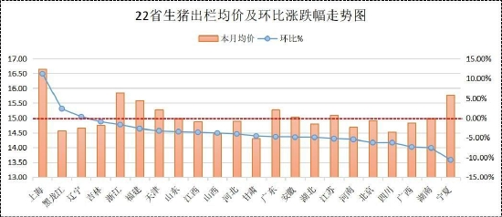 2月第一周受春节后养殖企业恢复出栏节奏,市场供应增加的影响,生猪出栏价格承压下跌。随着2月6日发改委发布猪粮比跌破5:1进入到下跌一级预警区域,将启动收储措施以稳定猪价,2月在政策性托底叠加下游屠宰企业加大冻品入库的共同影响下,市场情绪获得提振,生猪出栏价格快速触底反弹,当月生猪出栏价格呈现大幅反弹上涨走势。截止2月24日,当月全国生猪出栏均价报14.83元/公斤,较1月出栏均价15.49元/公斤,下跌0.66元/公斤,环比下跌4.26%。从22省市生猪出栏均价及涨跌幅排名来看,2月上涨省市合计3个,下跌省市合计19个,其中上海、黑龙江、辽宁地区生猪出栏均价分别环比上涨11.13%、2.32%、0.27%,居上涨前三位,东北地区整体以上涨为主。宁夏、湖南、广西地区生猪出栏均价分别环比下跌10.64%、7.61%、7.39%,居2月下跌前三位。