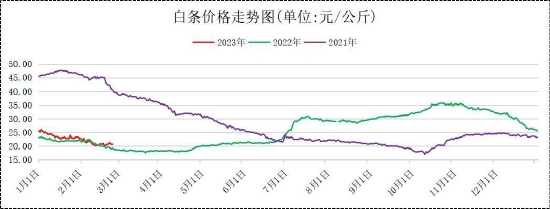春节后生猪消费逐渐进入到淡季,2月上旬白条价格呈现下跌寻底走势,中下旬白条价格有所震荡企稳,全月整体呈现下跌筑底走势。截止2月24日,根据农业农村部重点农产品信息平台监测数据,白条平均价格为20.99元/公斤,较1月平均价格23.74元/公斤,下跌2.75元/公斤,环比下跌11.58%。