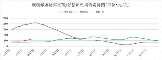 2月生猪出栏价格呈现大幅反弹上涨走势,局部地区发生的生猪疫情也刺激仔猪价格偏强运行,2月仔猪价格延续春节以来的上涨走势,并且涨幅随着生猪出栏价格的快速反弹而有所扩大,反映出当前养殖户对于下半年的生猪出栏价格并不悲观。截止2月24日,当月规模化养殖场7Kg仔猪平均出栏价格为437.26元/头,较1月平均出栏价格359.29元/头,上涨77.97元/头,环比上涨21.70%。