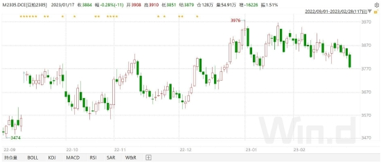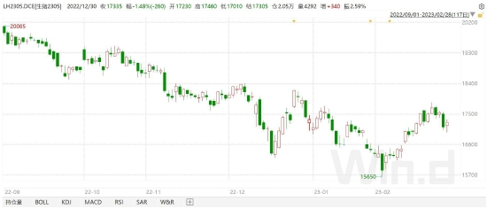 节后第一周,集团养殖户恢复出栏节奏,市场供应增加,生猪出栏价格承压下跌,期货市场跟随现货价格走势,亦向下跌破前期价格低点,创出2305合约挂牌以来价格新低15650元/吨。受节后第二周发改委发布收储消息的政策性托底以及下游屠宰企业加大冻品入库的影响,市场情绪得到提振,多头力量开始积累发力,期货价格2月中上旬呈现企稳反弹走高,并触及17840元/吨的高点,2月下旬涨势力量有所减弱。截止月末收盘,生猪期货2305合约收盘报17255元/吨,较1月结算价上涨770元/吨,涨幅4.67%,振幅13.33%,成交约34.80万手。