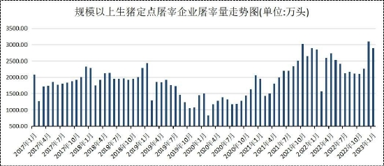 生猪消费具有季节性规律,临近春节期间,市场消费处于一年当中的旺季,受南方腌腊以及节前企业备货影响,屠宰量往往处于年内高点。根据农业农村部数据显示,去年12月规模以上生猪定点屠宰企业屠宰量高达3090万头,2023年1月下旬进入春节假期,屠宰企业放假,当月屠宰量也呈回落走势。截止1月末,当月屠宰量2897万头,环比下跌6.25%,2月处于消费淡季,屠宰缩量预计更加明显。