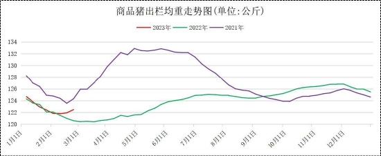 市场肥猪大部分集中春节前出栏,节后生猪消费进入淡季,生猪出栏体重也呈现规律性的下跌走势。2月上半月由于局部疫情影响,叠加消费进入淡季,养殖户有出栏节奏的安排,生猪出栏体重呈现震荡寻底筑底走势。下半月,前期压栏肥猪基本出清,商品猪出栏均重有所上涨。根据钢联数据显示,截止2月24日,样本企业商品猪出栏均重为121.98公斤,较1月出栏均重123.44公斤,下跌1.46公斤,环比下跌1.18%。
