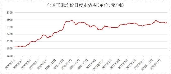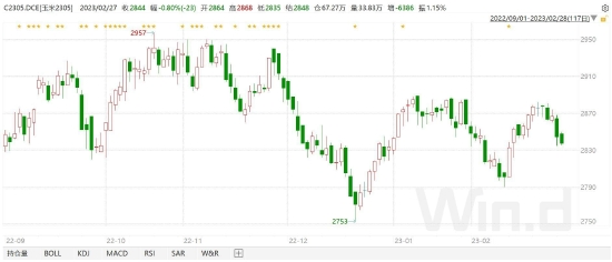 2月玉米现货市场价格偏弱运行,整体延续去年12月以来的下跌走势。根据钢联数据显示,截止2月24日,玉米现货均价报2873.11元/吨,较1月均价2887.5元/吨,下跌14.39元/吨,环比下跌0.50%。大商所玉米2305合约2月呈现震荡偏弱走势,截止月末收盘,2305合约收报2873元/吨,下跌26元/吨,跌幅0.91%,按单边计算,总成交约399万手,持仓约67.07万手,增仓260875手。