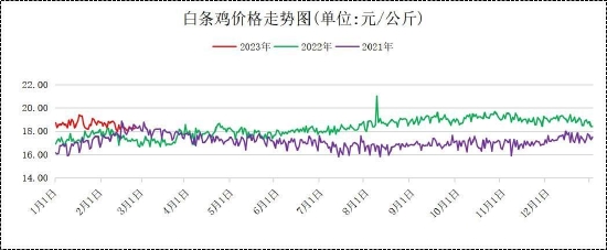 截止2月24日,当月全国农产品批发市场白条鸡平均批发价格报18.42元/公斤,较1月均价18.69元/公斤,下跌0.27元/公斤,环比下跌1.44%。