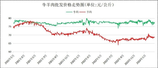 截止2月24日,当月全国农产品批发市场牛肉平均批发价报77.28元/公斤,较1月均价77.90元/公斤,下跌0.62元/公斤,环比下跌0.80%。羊肉平均批发价报68.63元/公斤,较1月68.47元/公斤,上涨0.16元/公斤,环比上涨0.23%。